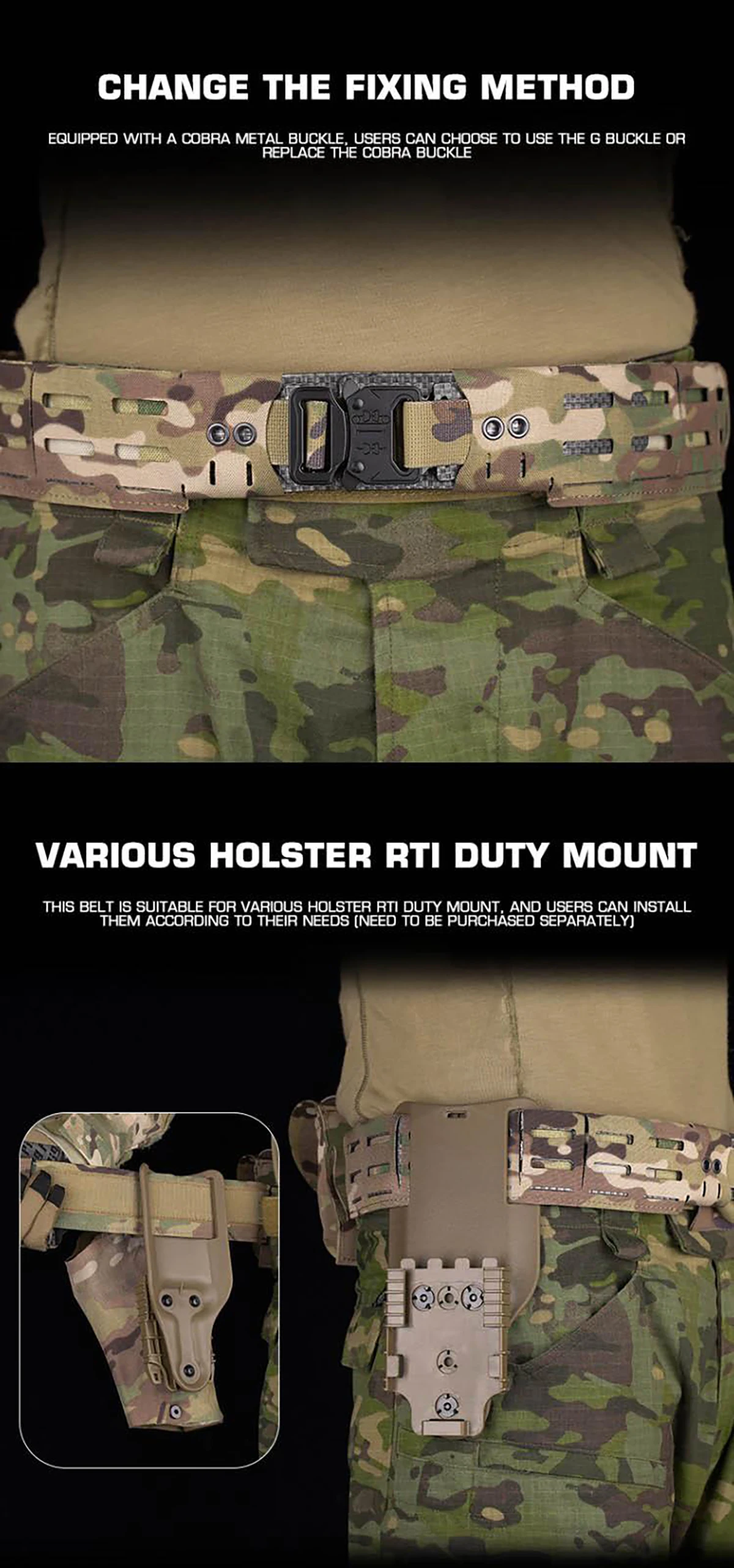 Opciones de doble hebilla y compatibilidad con funda: el cinturón ofrece una flexibilidad incomparable.Viene equipado con una hebilla G de liberación rápida e incluye una hebilla de metal Cobra para usuarios que prefieren ese estilo.También está adaptado para acomodar varios soportes metálicos RTI (Rapid Task Interface) para fundas (se venden por separado), lo que garantiza la compatibilidad con sistemas de fundas profesionales.