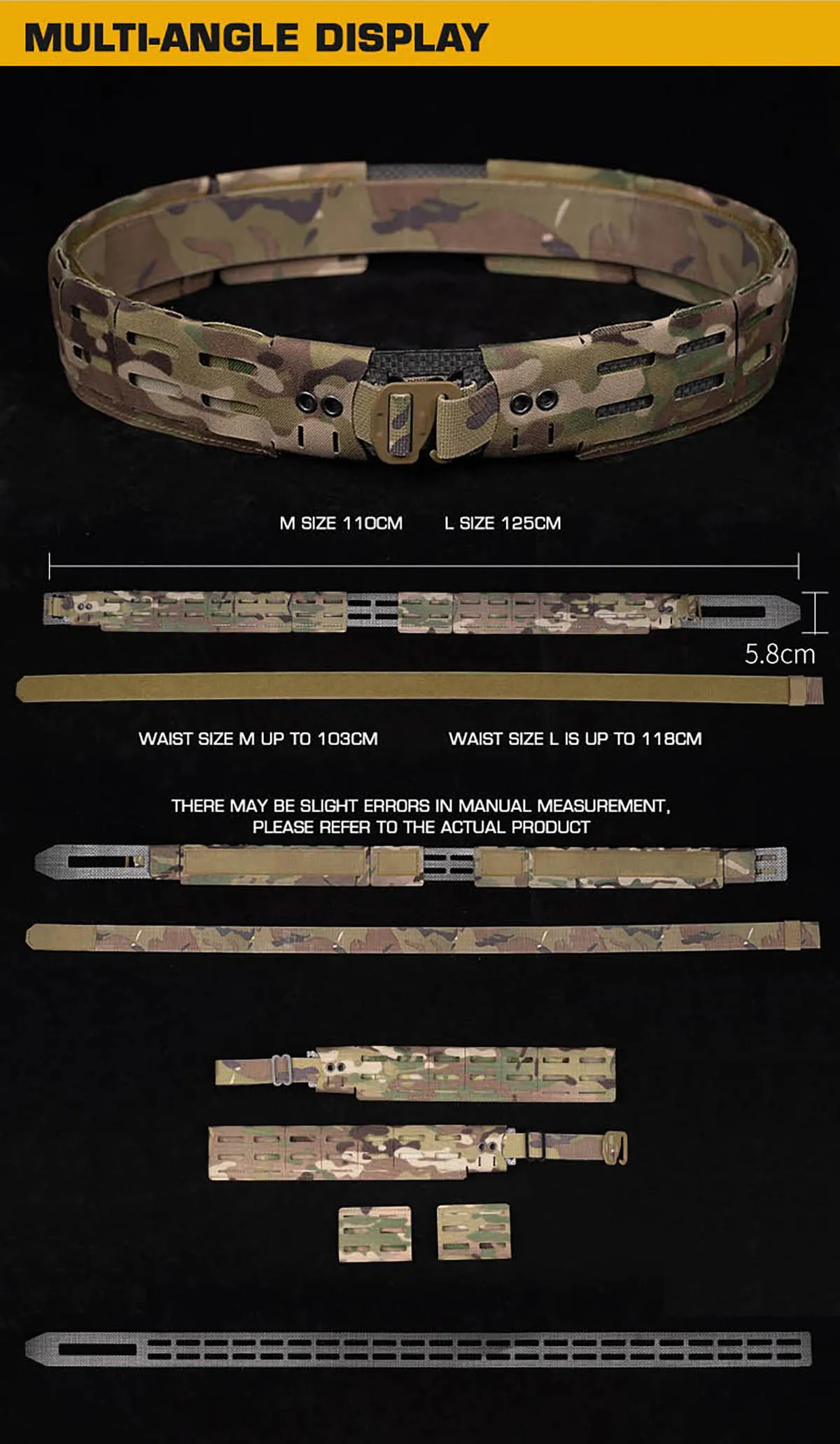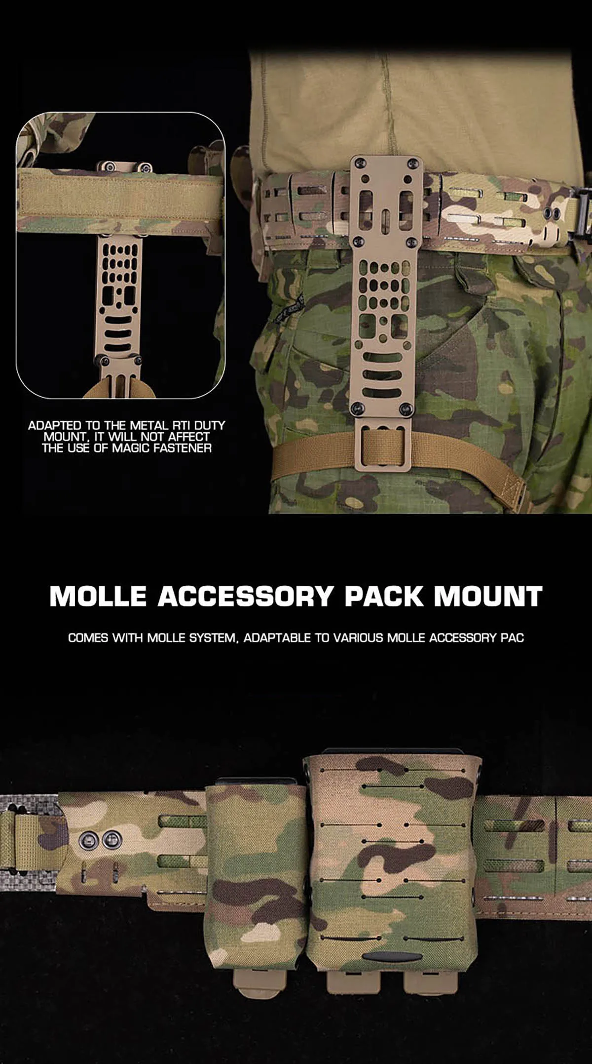 Personalización completa y ecosistema MOLLE: el cinturón exterior está construido con una rejilla de correas MOLLE/PALS completa, lo que le permite colocar una amplia gama de bolsas, fundas y accesorios compatibles con MOLLE.La sección trasera cuenta con soportes de accesorios deslizantes que se pueden ajustar o actualizar con paquetes MOLLE adicionales, lo que permite infinitas configuraciones de carga adaptadas a su misión.