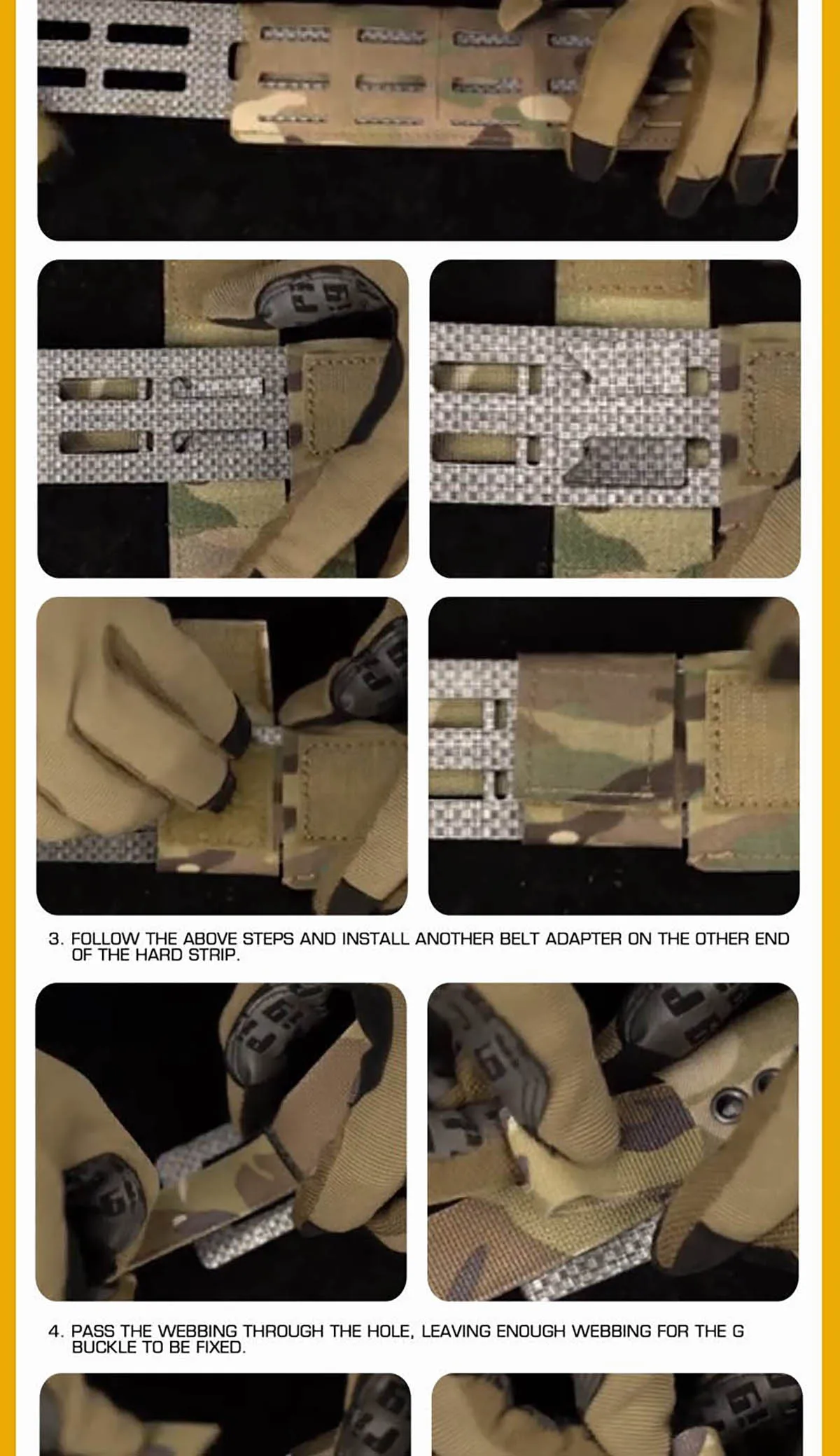 Instalación intuitiva y segura: nuestra guía visual paso a paso (incluida en las imágenes) hace que la configuración sea sencilla.El sistema utiliza una combinación de una tira dura, adaptadores de cinturón, cierre mágico (gancho y bucle) y correas para crear una conexión increíblemente segura que no fallará durante las actividades dinámicas.