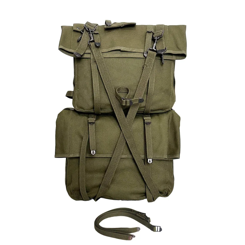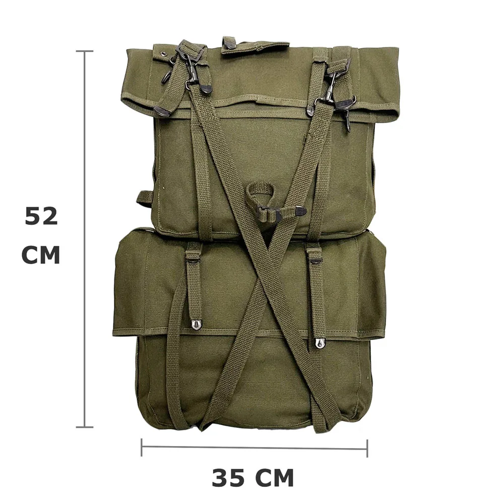 Detalles: Hecho de lona verde oliva, botones metálicos, refuerzo de cuero y estructura clásica de correa para el hombro en forma de "H", recrea la durabilidad robusta de los roducts de la Segunda Guerra Mundial.