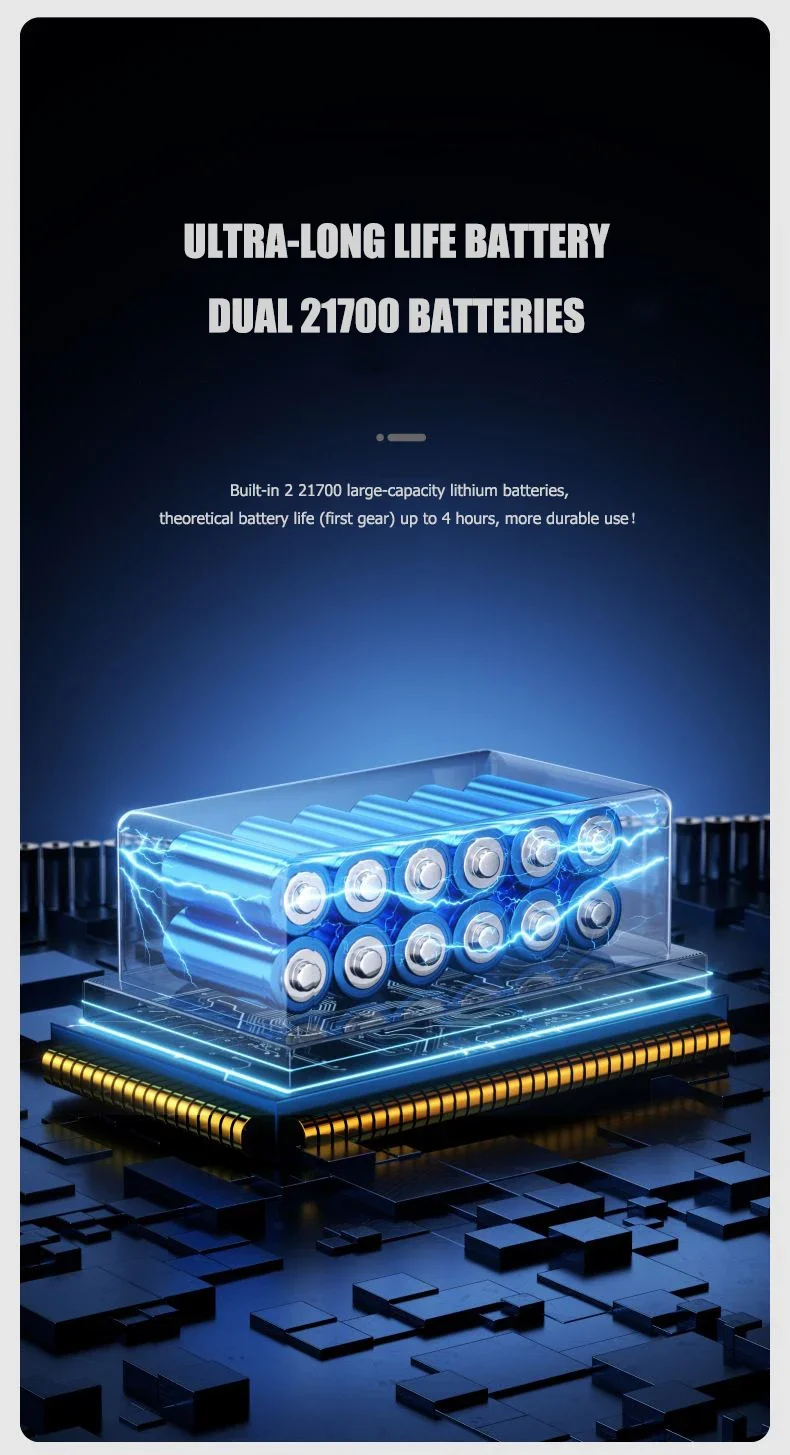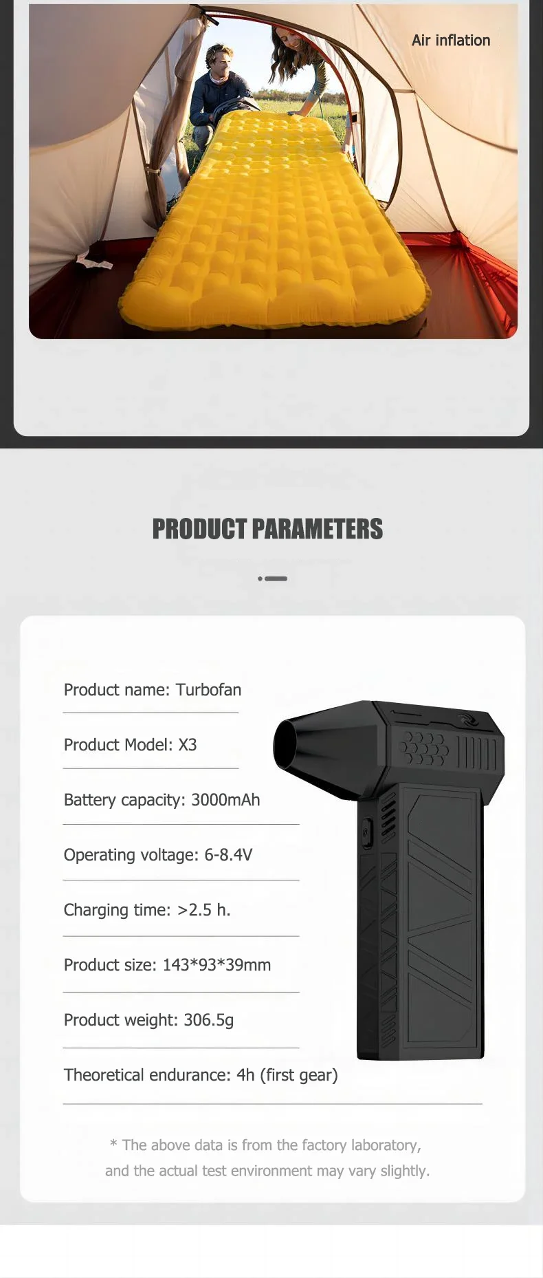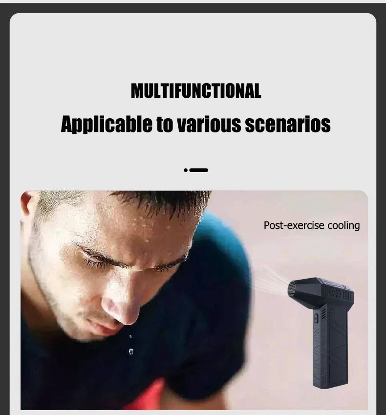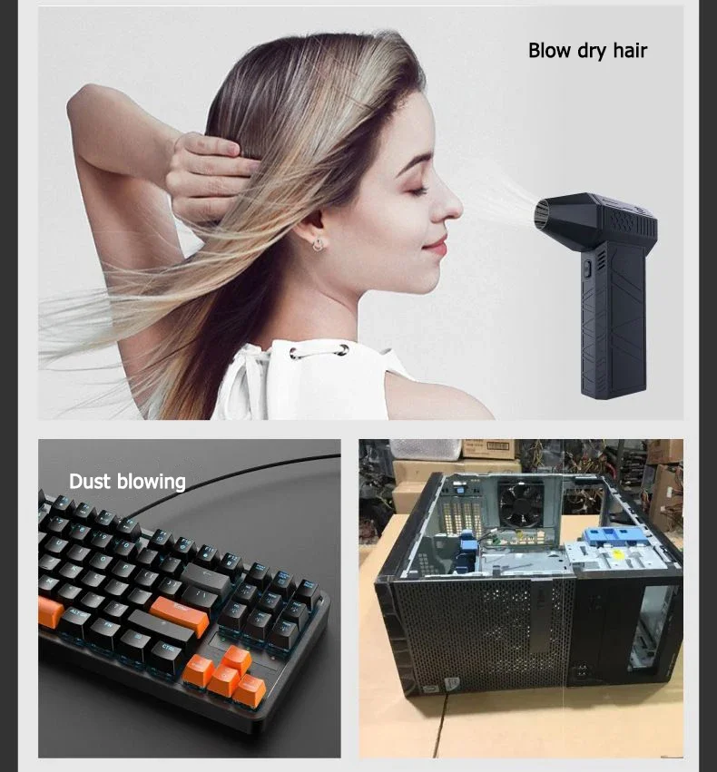 1.Componentes de alta calidad: este mini ventilador turbo jet adopta rodamientos de alta velocidad importados de súper alta calidad, una turbina de metal CNC nueva, un motor sin escobillas y un motor enrollado a mano.2.Velocidad del viento súper fuerte: capaz de generar presión y velocidad superiores a 52 metros por segundo.La máquina tiene cuatro branquias de tiburón que disipan activamente el calor a través de las salidas de aire, expulsando eficazmente el aire caliente de la cabina y brindando protección para un funcionamiento duradero.3.Regulación de tres velocidades: viento fuerte de primera marcha, huracán de segunda marcha, huracán súper fuerte de tercera marcha, fuerza del viento de hasta 16 niveles4.Portátil y compacto: con su tamaño mini y diseño liviano, es muy cómodo de llevar.El cuerpo compacto del ventilador turbo frenzy hace que sea fácil de transportar y de usar en el exterior.7.Operación fácil de usar: adopción de regulación de tres velocidades con indicador luminoso.El diseño fácil de usar de los turboventiladores portátiles garantiza una fácil funcionalidad.Además, la placa de carga también cuenta con funciones de protección de carga y protección contra sobrecalentamiento seguras y confiables.El motor interno sin escobillas puede alcanzar altas velocidades de hasta 130000 RPM (voluciones por minuto).8.Uso: soplado y succión con colchón de aire, limpieza de equipos informáticos, soplado de polvo industrial, combustión de carbón para soportar la combustión, soplado de automóviles y nieve, filmación de estudios de películas y fabricación de viento, secado de mascotas y muchos otros usos.Especificaciones: