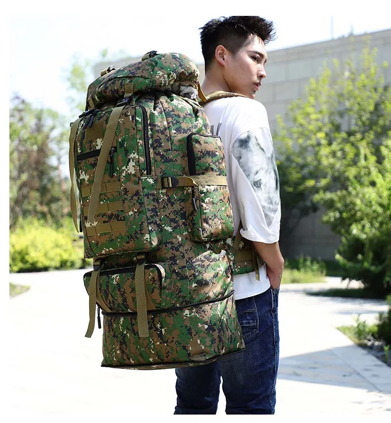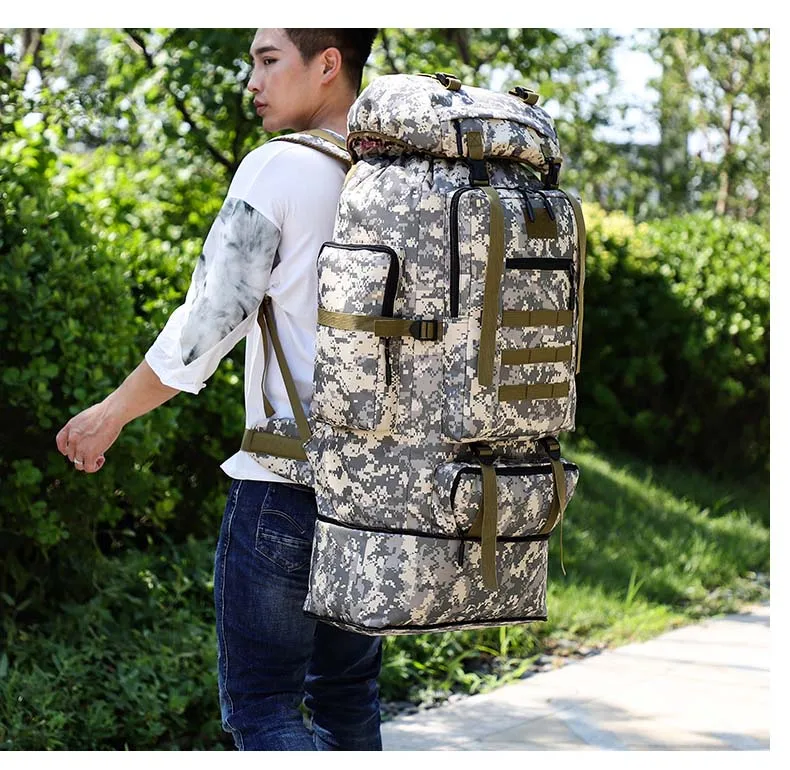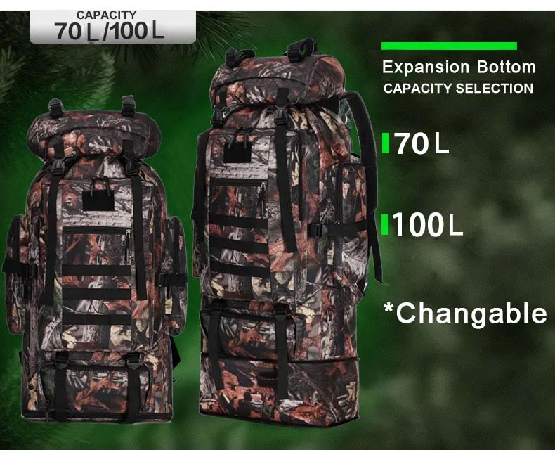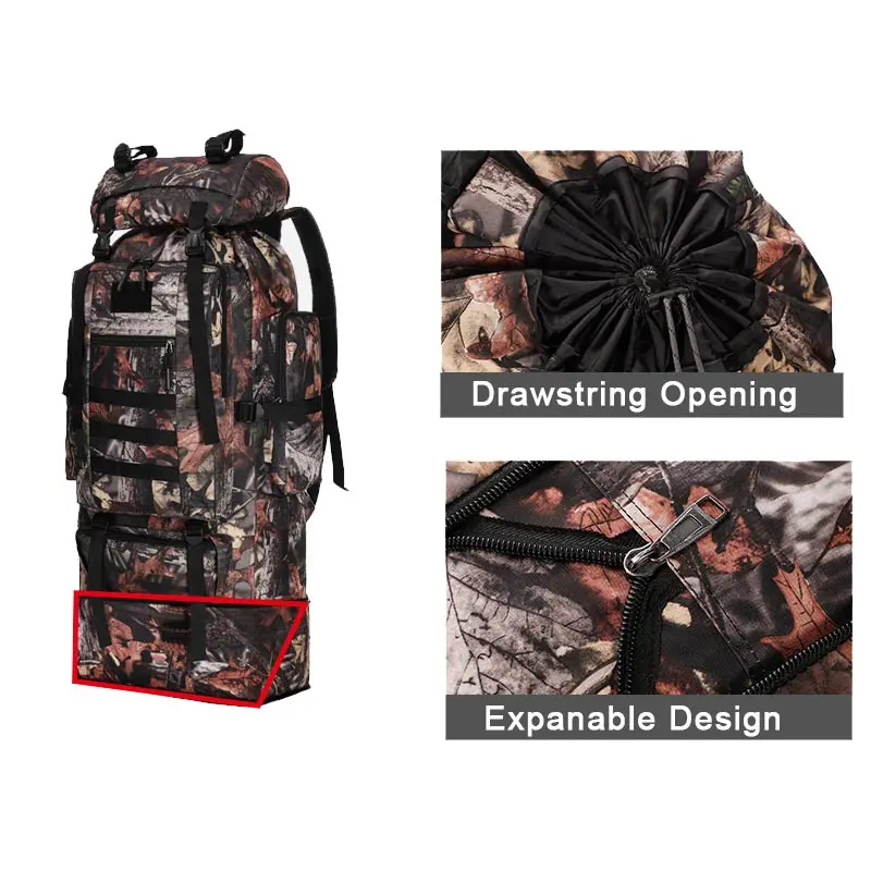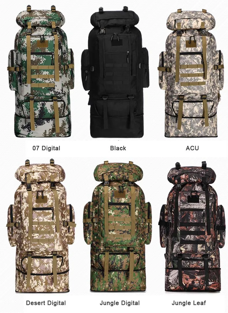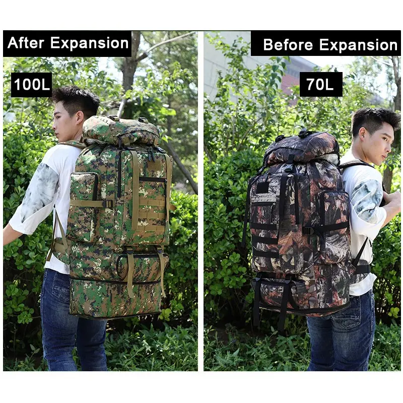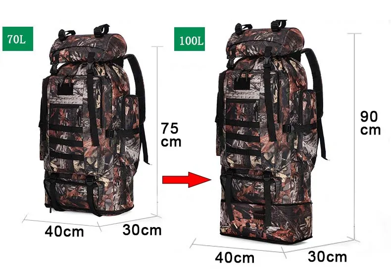 Material: nailon impermeable de alta calidadTamaño: 40cm x 30cm x 75cm(LxWxH)Tamaño después de la expansión: 40cm x 30cm x 90cm(LxWxH)Color: negro, hoja de la jungla ACU Desert Digital, etc.Uso: mochila de viaje, mochilas de montañismo, mochila de camuflajeOcasión: senderismo, camping, ciclismo, montañismo, viajes, escalada