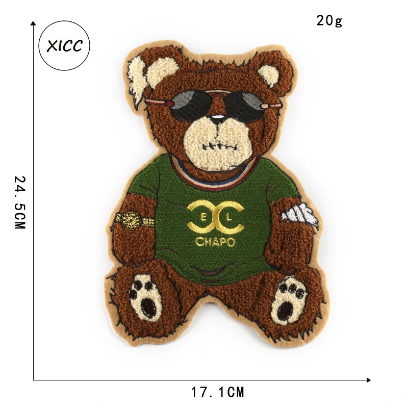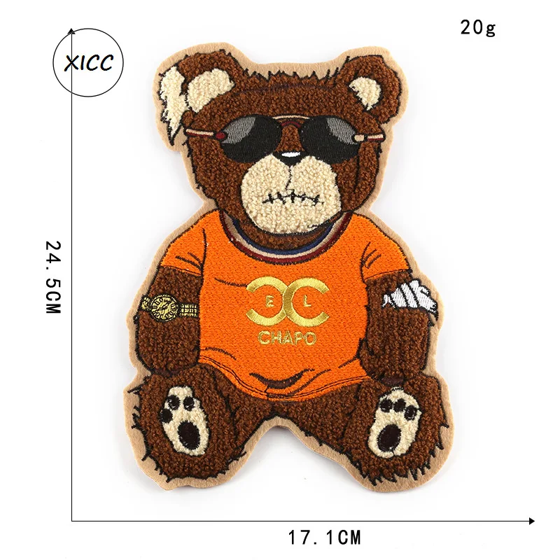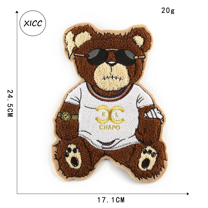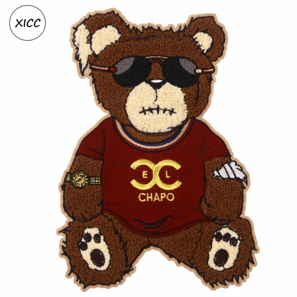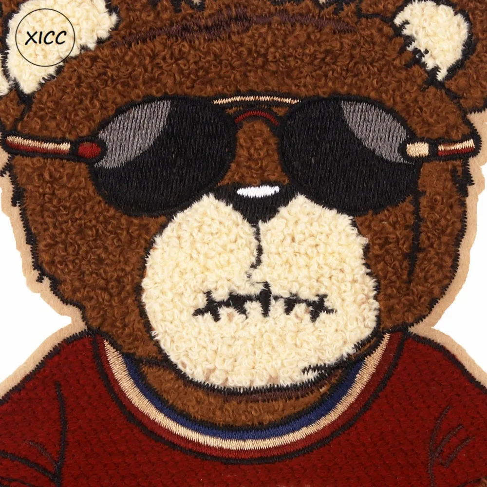 XICC Toalla de gran tamaño bordado Oso de dibujos animados parche personalizado Chenille coser en parche Super Cool gafas de sol Patchwork pegatina apliques
