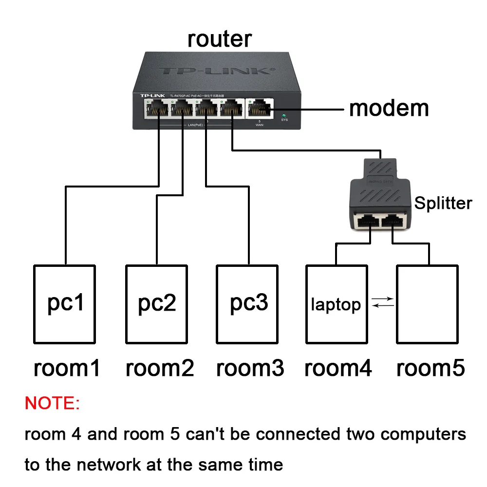 Tienes cinco habitaciones, pero tu enrutador tiene solo cuatro puertos LAN.Canta un puerto.Puede utilizar este divisor para ampliar un cable de red para conectarse a la quinta habitación.Cuando mueva su computadora portátil desde la cuarta habitación a la quinta habitación, conecte el cable de Internet y también podrá conectarse a la red.Pero no puedes conectarte a la red en la cuarta y quinta habitaciones al mismo tiempo.