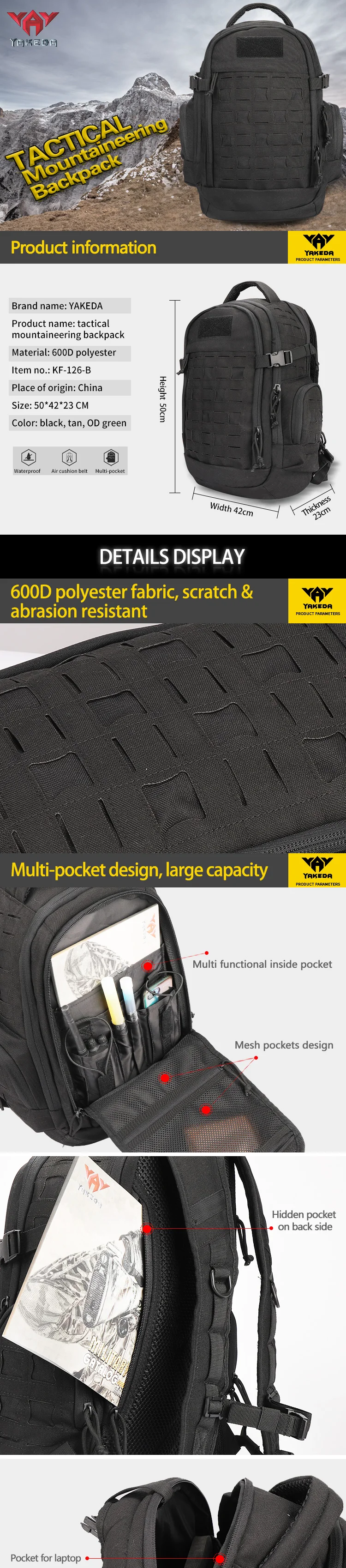 YAKEDA-mochila táctica Molle de asalto para fanáticos, bolsa deportiva 600D para exteriores, bolsas de alta capacidad para turismo, senderismo, montaña y acampada
