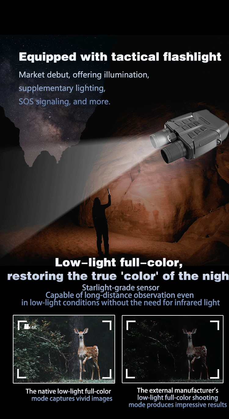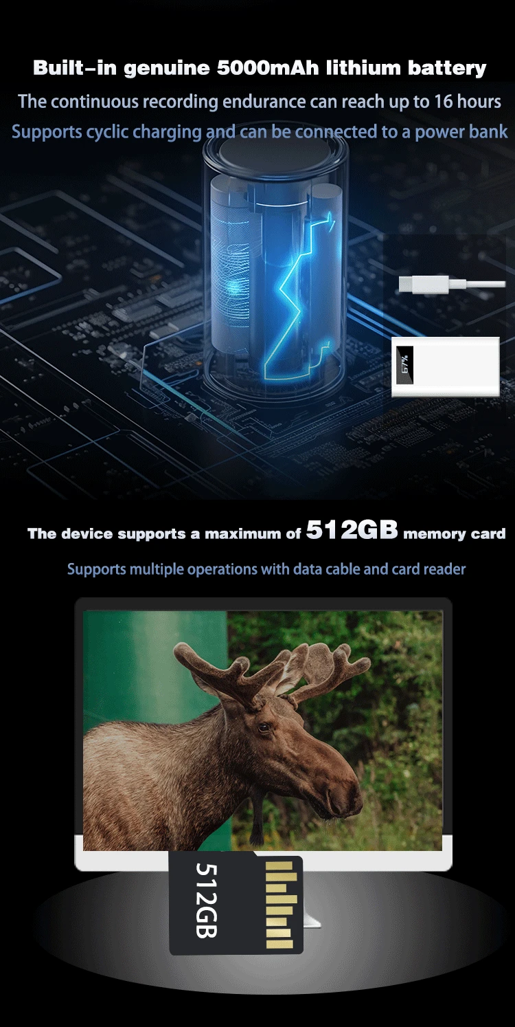♦ Equipado con luces tácticas, las primeras del mercado, se pueden utilizar para iluminación, luz de relleno y ayuda, etc.♦ Batería de litio real incorporada de 5000 mAh, recargable, el tiempo de grabación continua puede alcanzar las 16 horas