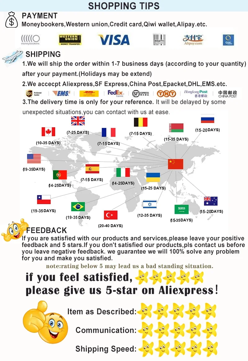 Sobre Dropshipping y venta al por mayor:Admitimos dropshipping y venta al por mayor. Puede ponerse en contacto con nosotros con facilidad, podemos proporcionarle el mejor precio.