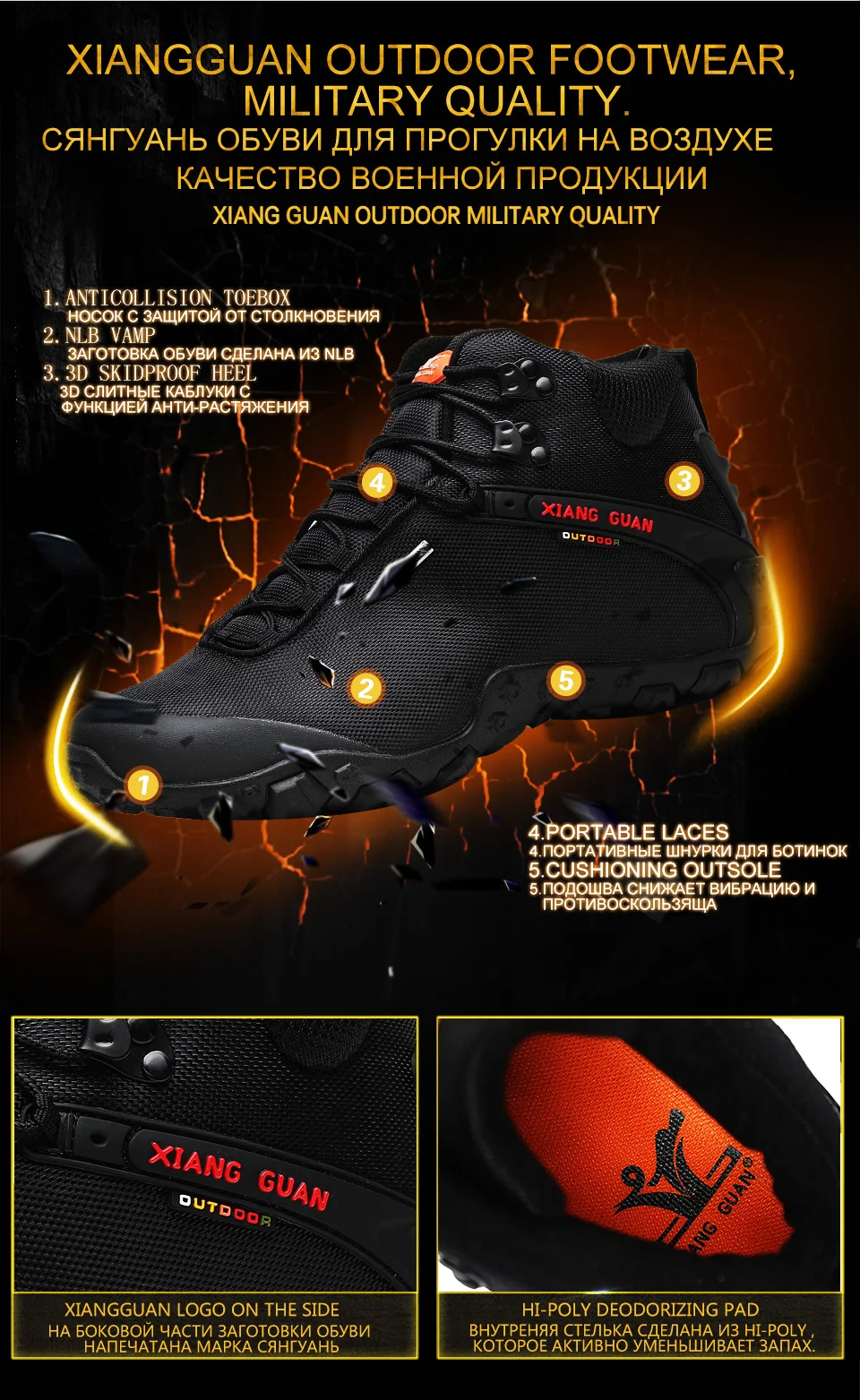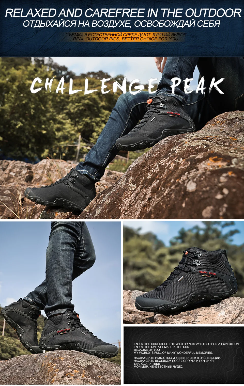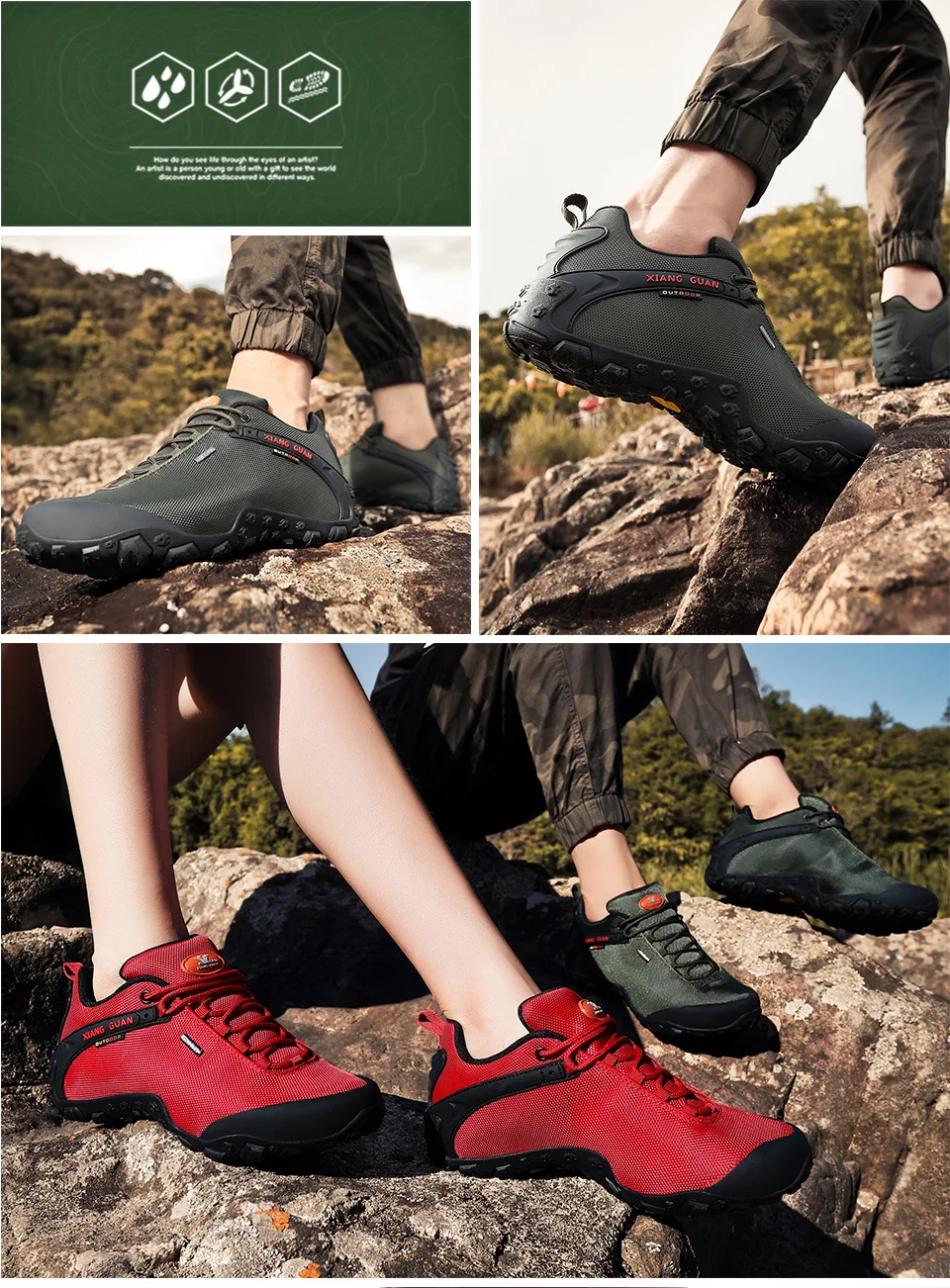 XIANG GUAN es una marca líder china en actividades al aire libre. Nuestra empresa está especializada en la producción de zapatos de senderismo y zapatos para exteriores. XIANG GUAN Outdoor Products Limited Company está afiliada a Putian Traveler Outdoor Products Limited Company. Nuestra empresa fue fundada en 2006 y nuestra empresa compone el exterior de China El legendario capítulo de la empresa con una tasa anual de crecimiento de compuestos saludables de más del 50% a lo largo de los años. ¡Nuestra naturaleza no cambia incluso después de años de viento y lluvia! Después de muchos años de formación y desarrollo, la marca XIANG GUAN se ha apegado a la defensa de la protección del medio ambiente al aire libre y las llamadas Para que los amantes del aire libre presten siempre atención a la protección del medio ambiente cuando disfruten de las actividades al aire libre. Sobre la base de este concepto, cada pieza de productos para exteriores de la marca XIANG GUAN está hecha con materiales respetuosos con el medio ambiente para minimizar el impacto de las actividades humanas en la naturaleza.