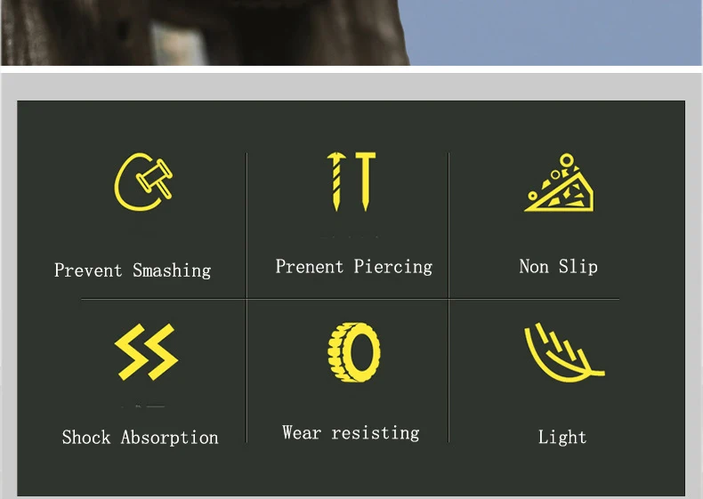 Functional anti-smashingSole: beef tendonToe cap: high quality steel toe capLining: stab-resistant soft medium and lowUses: military tactichandling, workshop production, car repair, machining, steelmaking, outdoor climbing, all kinds of dangerous work protection