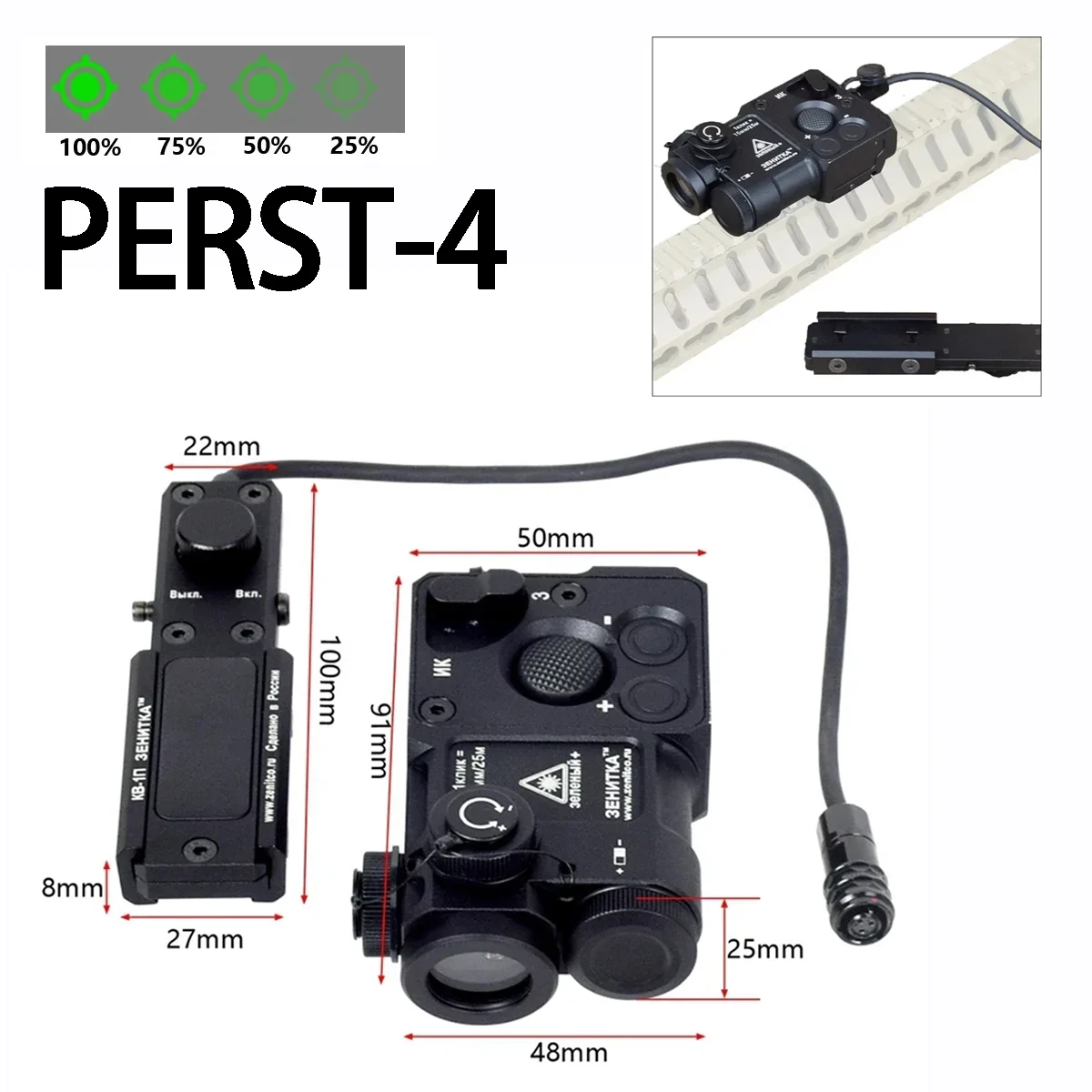 Perst-4 se utiliza para señalar objetivos al observar, inspeccionar y observar armas pequeñas disparando por la noche.Este producto es un pequeño dispositivo mecánico óptico que forma un flujo de radiación láser.Este producto se instala en rieles Picatinny.El interruptor táctico KV-D2 (en el kit) se puede instalar en rieles Picatinny y rieles 1913.Perst-4 contiene 2 funciones láser: