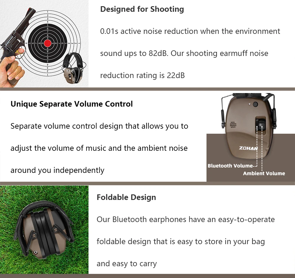 Diseño plegable compacto para fácil transporte. Recomendado para tiro de tiro, caza, carpintería, corte de césped, motosierras y cualquier entorno ruidoso. (ATENCIÓN: alimentado por 2 pilas AAA, NO INCLUIDAS)