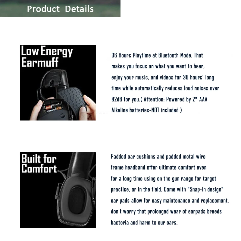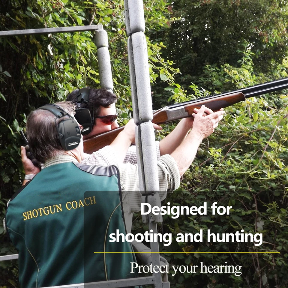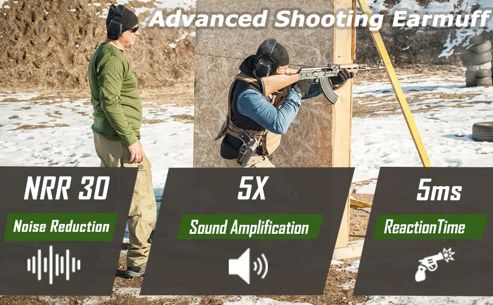 DESIGNED FOR SHOOTING AND HUNTING: NRR 22dB/SNR 27dB. Durable recessed microphones could increase tinny environmental sound when the sound is less than 82dB while reduces wind noise, providing enhanced communication for hunting, shooting, etc; And the earmuffs with slim low-profile cups with cut-outs perfect for firearm stock clearance&rifleotgun use