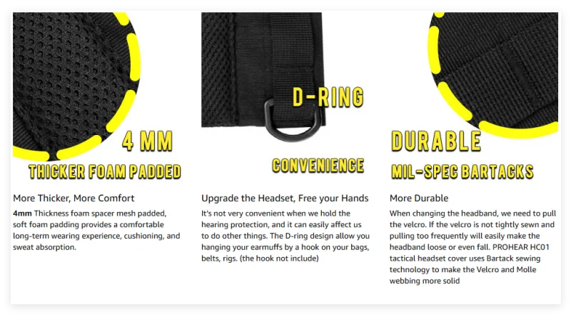 Adecuado para auriculares de gran mayoría: largo-8,9 pulgadas, ancho cuando está expandido-6,2 pulgadas, ancho cuando está plegado-2,1 pulgadas, acolchado de espuma de malla-4 mm.Apto para Howard Leight (serie Impact, serie Sync, serie Thunder, serie Leightning), 3M (serie Peltor, serie WorkTunes), Walkers (serie Razor, serie XCEL), Act Fire, MSA, COM-TAC II, auriculares militares Orejeras tácticas e incluso sobre una correa de bolso.Adecuado para entrenamiento militar, caza, tiro, carpintería, motosierra, etc.