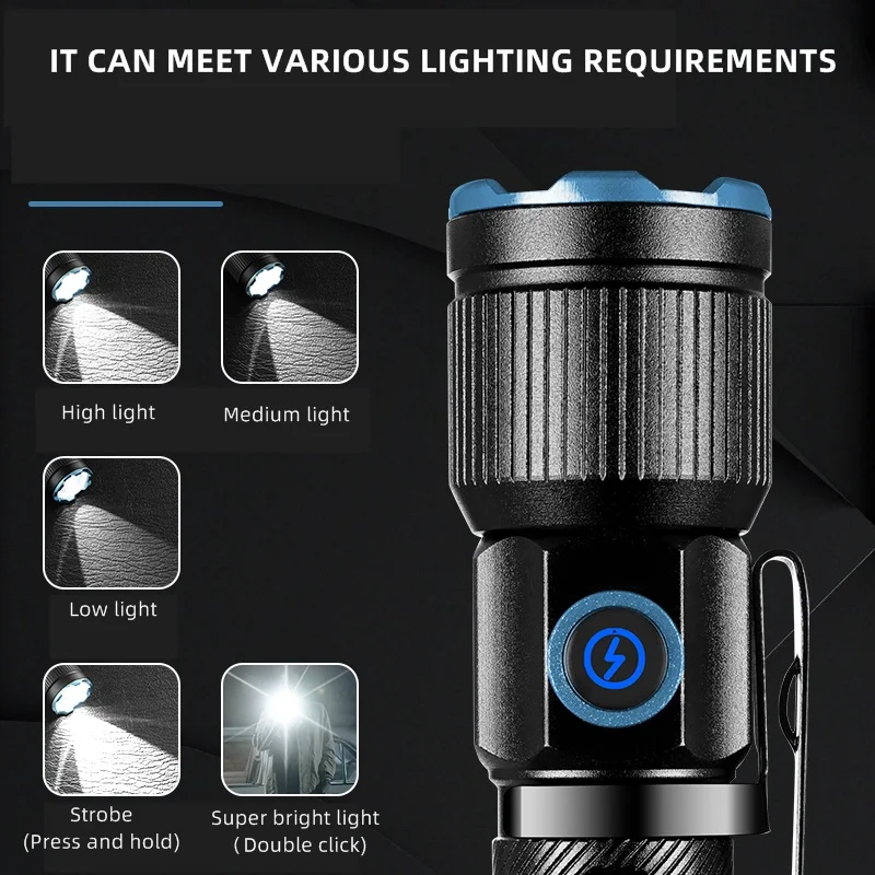 5modes: High light - Medium light - Low light - Strobe(Press and hold) - Super bright light(Double click,any gear can double click )